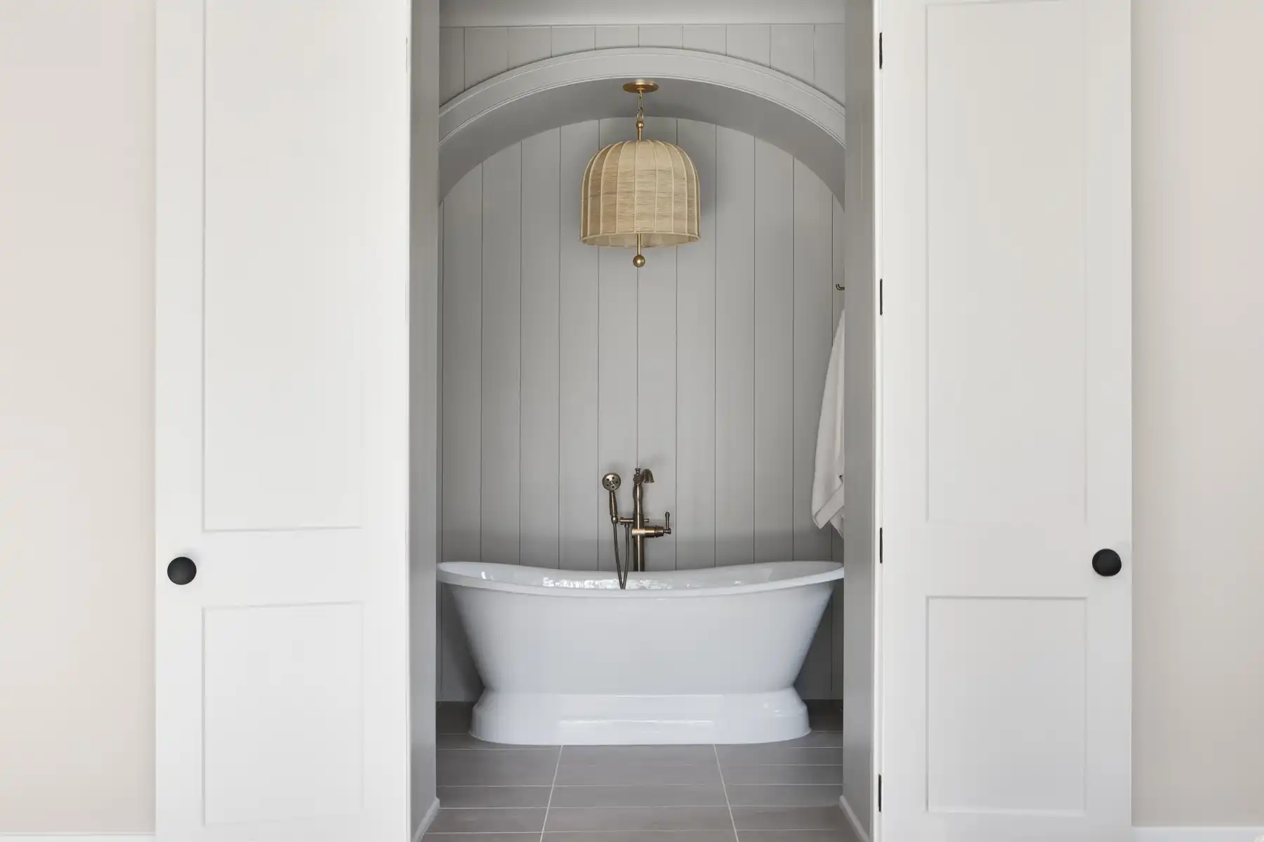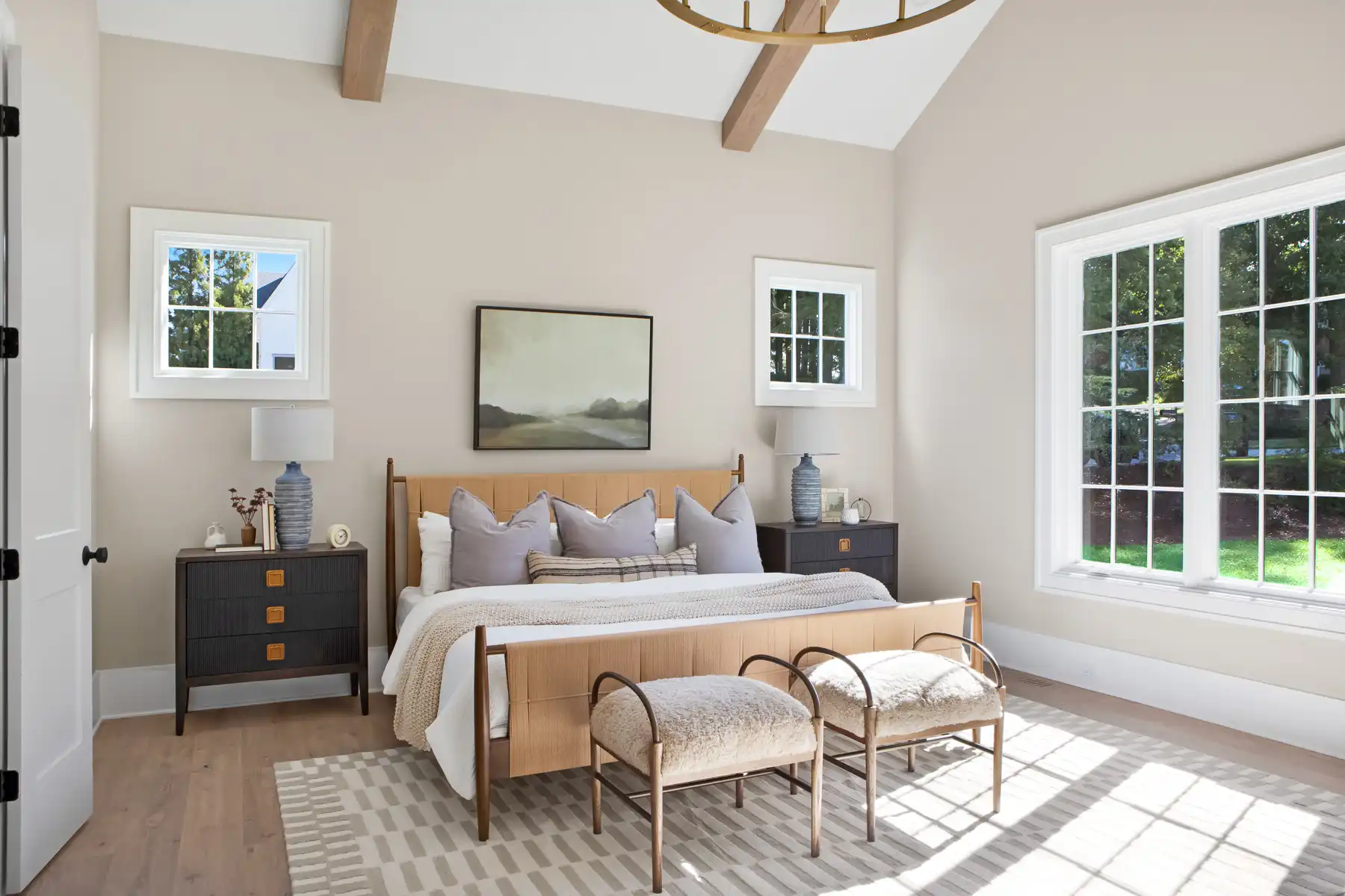 Upstairs, the primary suite is a sanctuary of scale and serenity, with vaulted, beamed ceilings and a striking chandelier. The spa-inspired bath feels like a work of art, with a custom arched niche cradling the freestanding tub beneath its own chandelier, separate vanities, and a beautifully tiled walk-in shower. Three additional bedrooms each have their own individually designed ensuite bath, and a generous bonus room with a wet bar is ready for game nights, movie marathons, or weekend hosting. Halcyon’s thoughtful design is evident in every finish, fixture, and sightline.