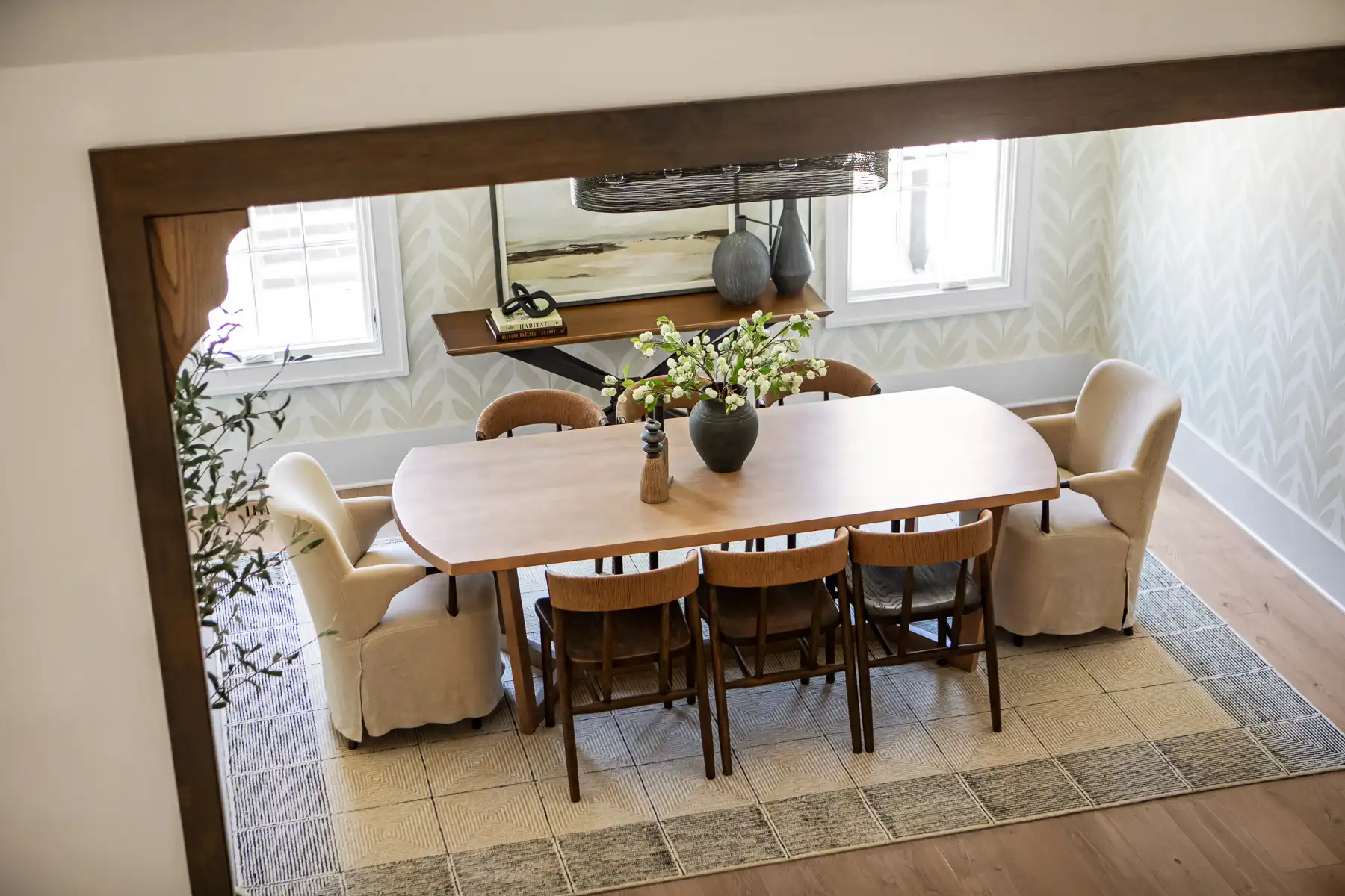 Inside, wide-plank oak hardwoods and custom trim introduce a refined palette that carries throughout, with a floor plan where every space feels intentional and elevated. Just off the foyer, a stunning front office with built-ins and designer lighting offers a dramatic backdrop for work or quiet focus, while the formal dining room wrapped in Spoonflower wallpaper sets the stage for memorable dinners. The great room centers on a sculptural fireplace and flows seamlessly into a magazine-worthy kitchen.