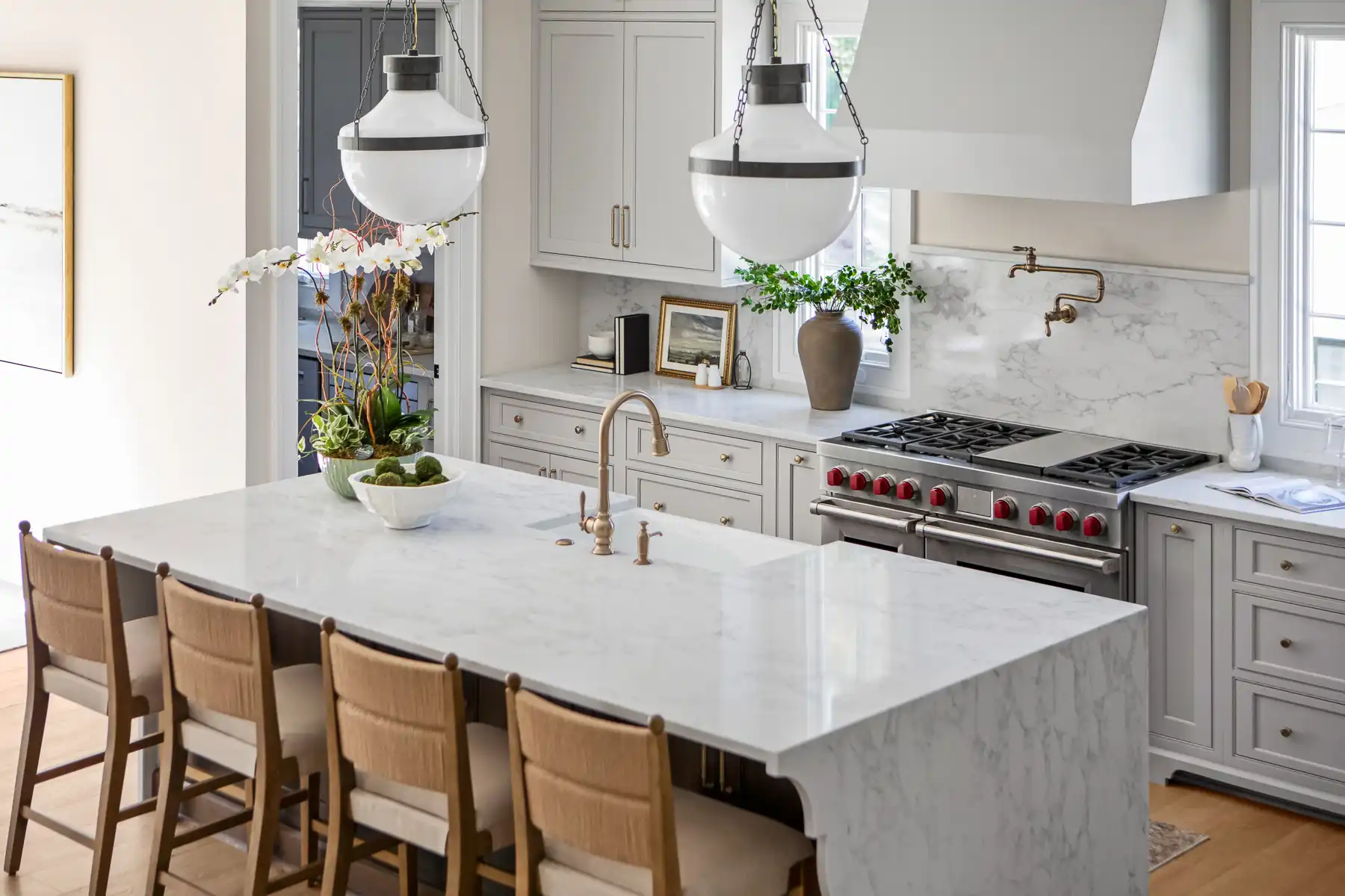 Two-toned, ceiling-height cabinetry, a bespoke hood framing the Wolf gas range, and a paneled Sub-Zero refrigerator create a true chef’s workspace, while the statement island topped with Calacatta Apuano quartz with subtle veining and a soft curved edge becomes the heart of everyday life and entertaining. A fully outfitted scullery extends the functionality with additional cabinetry, a second dishwasher, and a second sink, keeping prep and cleanup beautifully tucked away. Indoor and outdoor living are effortlessly connected with double sliders that open to a flagstone patio with an outdoor fireplace and Phantom screens.