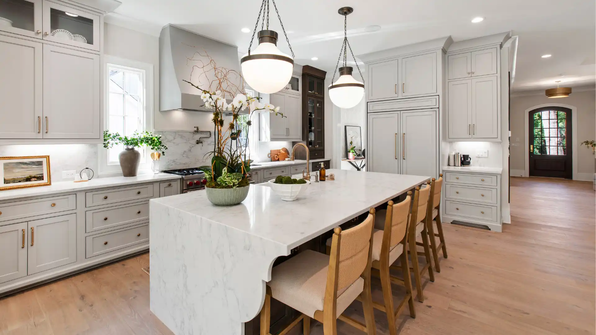 Quartz, marble, and even honed granite are popular materials, often paired with dramatic veining or rich color. But beyond aesthetics, these islands offer function: ample prep space, hidden storage, and plenty of seating for casual meals or cocktail hour. For buyers who love to entertain, a waterfall island is both centerpiece and conversation starter.
