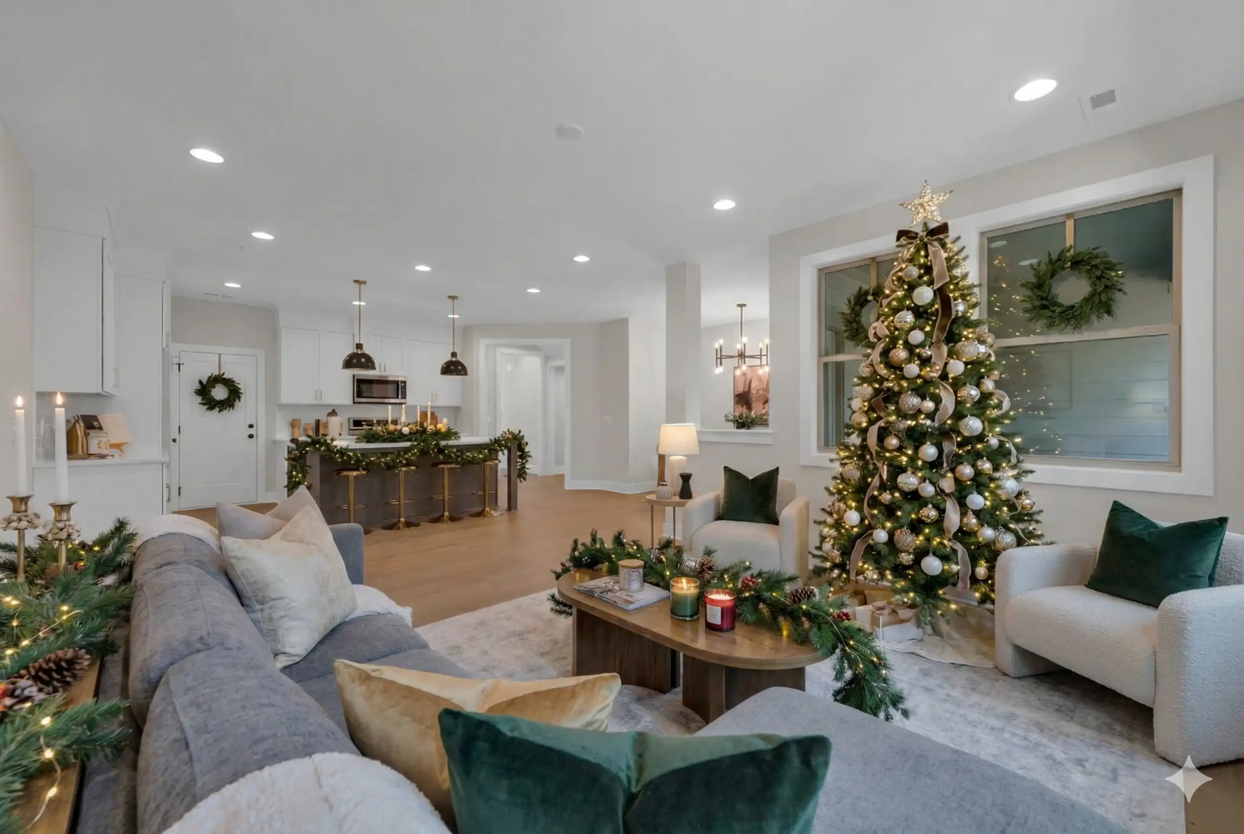 The same kitchen that feels bright and airy in listing photos becomes the backdrop for cookie decorating and morning coffee by the tree. The living room you toured in September is now glowing with candles on the mantle and stockings hung with care. That open floor plan? It’s suddenly full of laughter spilling from room to room.
