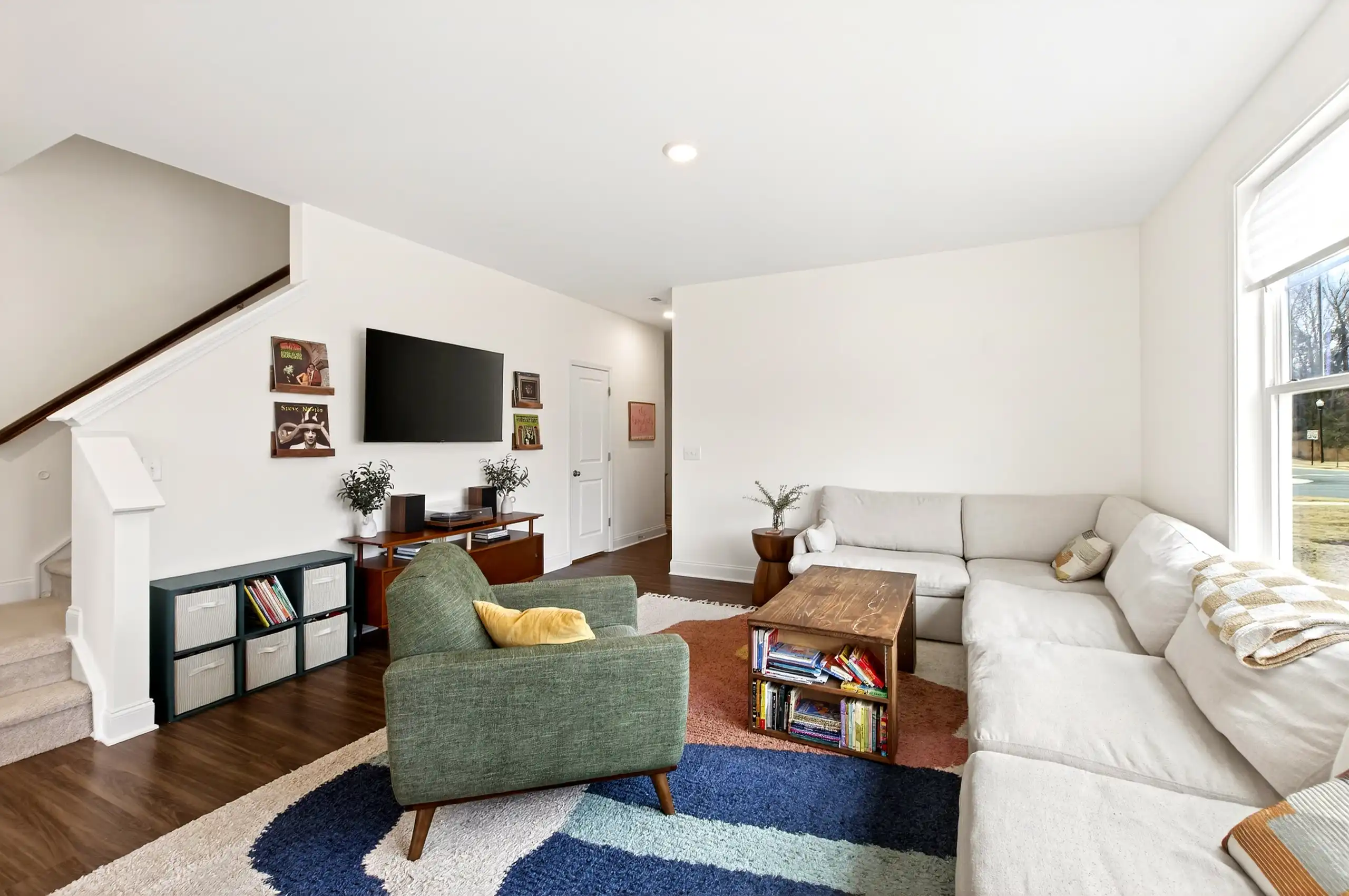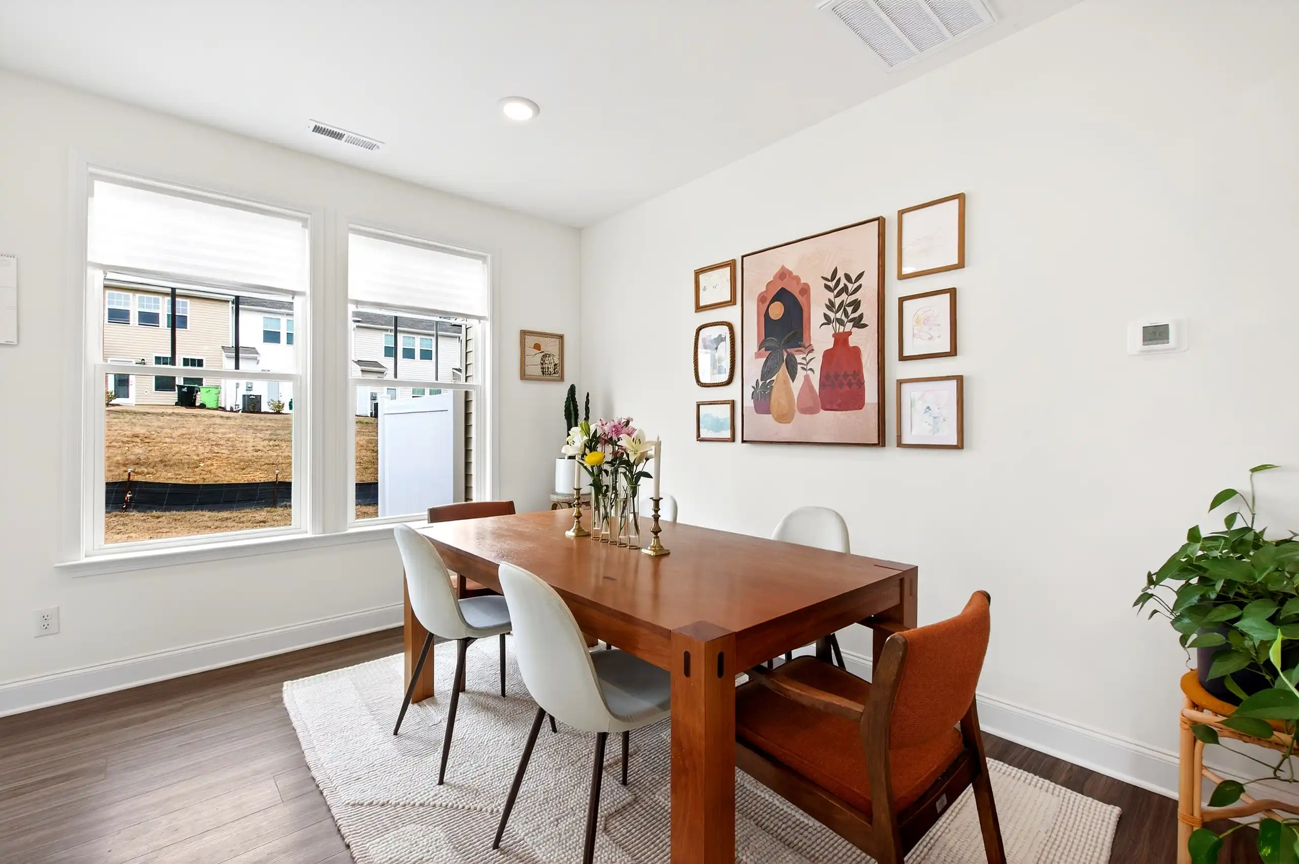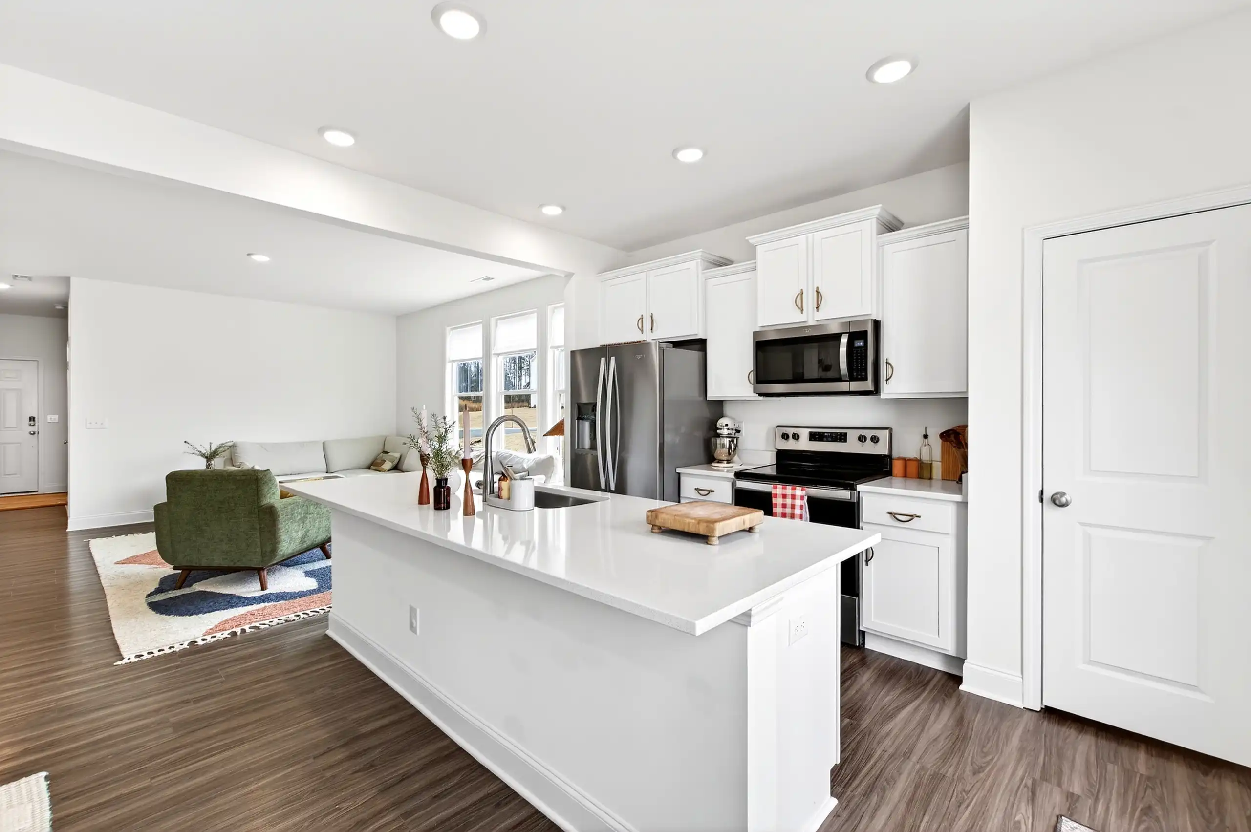 Welcome to a better-than-new 2023 end-unit townhome that’s been thoughtfully upgraded so you can move right in and start enjoying it. On the first level, the open-concept living room is spacious and filled with natural light, flowing seamlessly into the kitchen with white cabinetry and upgraded hardware. Just off the kitchen, the dining nook is perfectly placed for everyday meals or lingering conversations while you finish dinner.