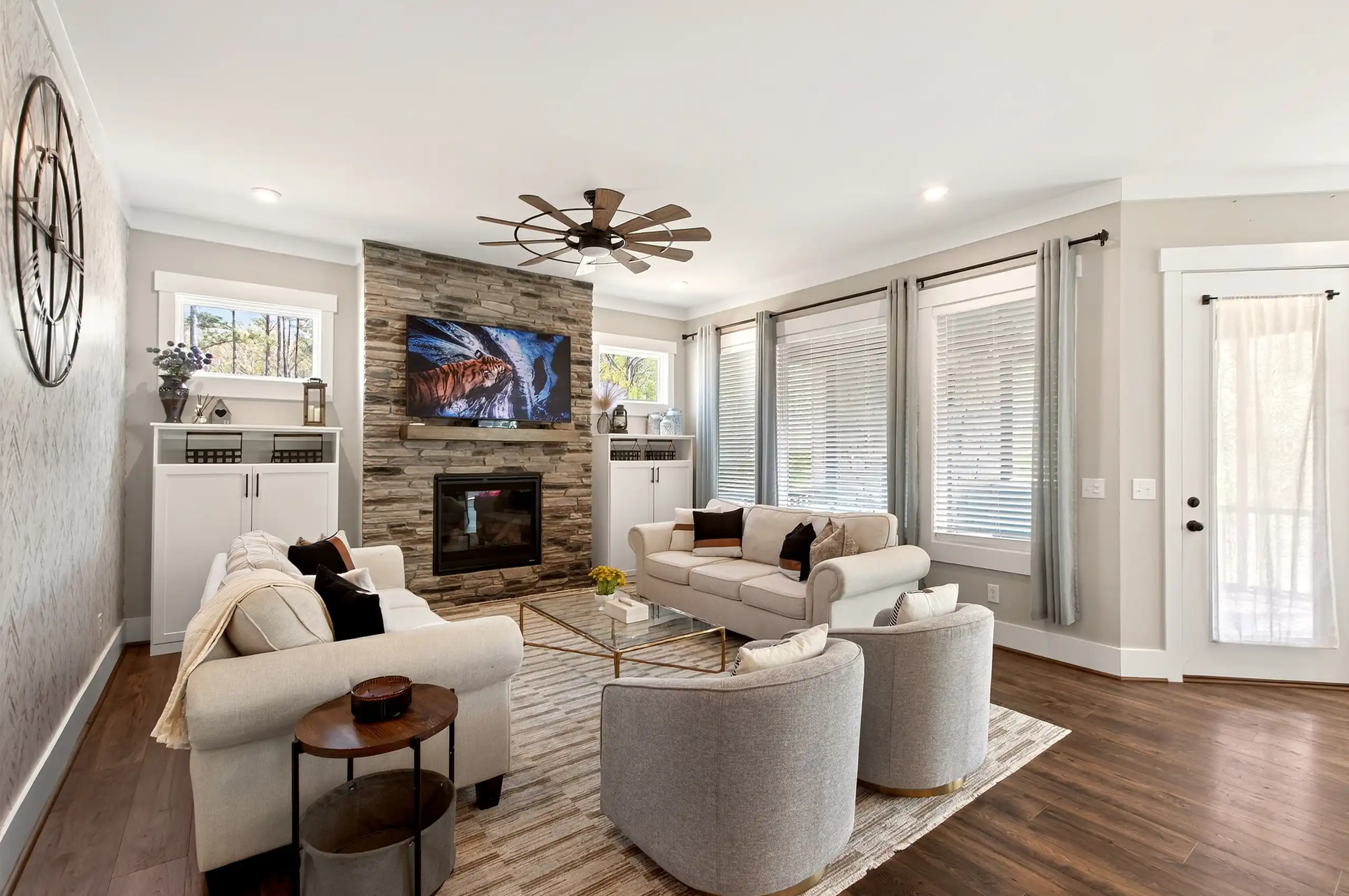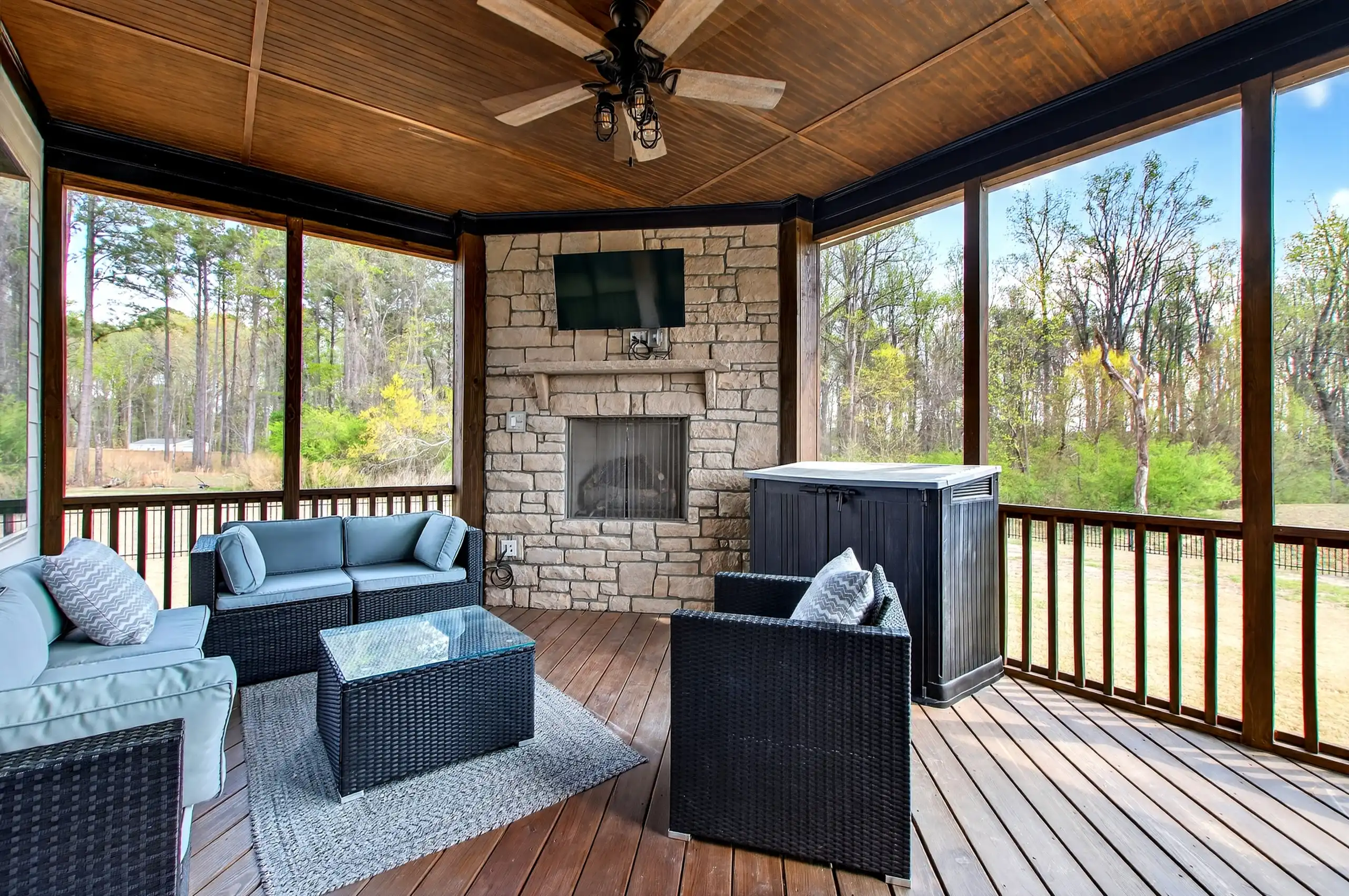 Welcome to a beautifully crafted Craftsman style home set on a sprawling, nearly acre sized flat lot in a peaceful Willow Spring setting framed by mature hardwoods. Timeless character and modern comfort come together from the moment you arrive, beginning with the welcoming front porch and impressive two story foyer. The main level offers a guest suite and a versatile flex space that can serve a variety of needs, while the inviting family room features a striking stone fireplace, custom built ins, and expansive windows that bring in natural light. The kitchen is designed for both everyday living and entertaining with ceiling height cabinetry, a gas range with pot filler, a walk in pantry, and a wet bar area. Upstairs, spacious secondary bedrooms provide flexibility, including one with a private en suite bath, along with a loft that adds even more usable living space. The primary suite offers a refined retreat with a spa inspired bath, separate vanities, a walk in shower, and a custom closet. Outdoor living continues on the screened porch, complete with its own stone fireplace and views of the expansive backyard.